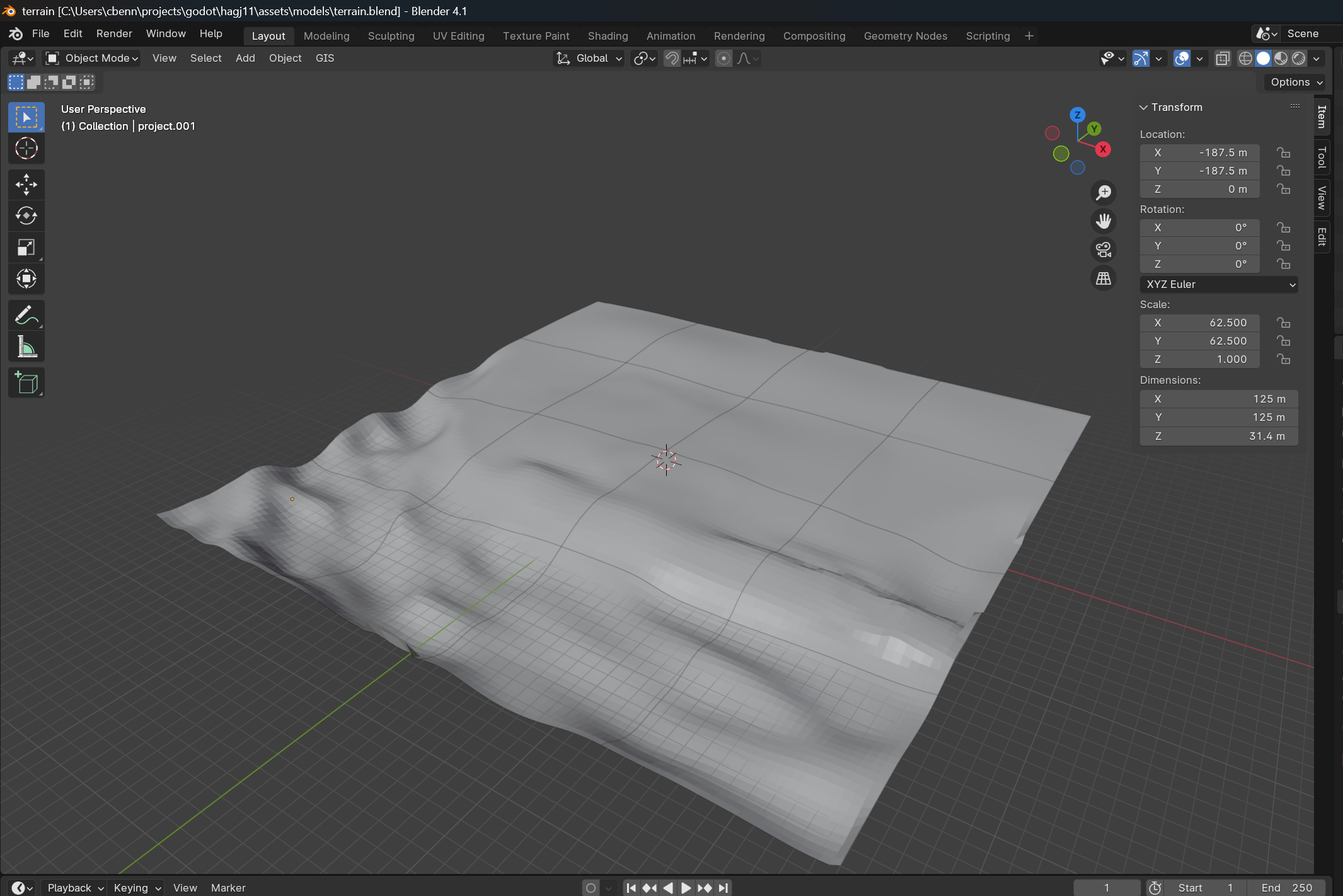 Game design aside, Arkasaur [programming, UX, etc.] did a fair fork of his own research to map the terrain of the Holy Isle. The original idea was to use GIS data and map the surface with an add-on, but in the end this beauty was manually sculpted by a guy who doesn’t consider himself an artist. Later, he worked heavily between Google Maps and the surface texture, in part to get the building areas flat. It ended up making the most of the lighting effect he’d built in too, which looks damn good imo.