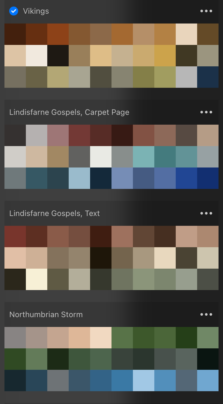 Meanwhile, my primary battle has been with the modular functionality of the Vikings themselves. Drafting UI and hunting historical visuals was easy swimming compared to this — so different from the gestural portraits and compositional asymmetry all artists draw on. I’ve focused on the structural bases so that the details can wash easily. I’ve been drawing in Procreate, and finally figured out how to use the Reference tool properly. Extra drawing aids like the Symmetry tool have been used sparingly (it kind of doesn’t make sense, say, for the front and back of hands — at least not the way I draw figures). Besides, symmetry doesn’t really fit the art theme of either culture at this time. The painting stage should be nice and easy: I built a pretty comprehensive palette for the game based on a couple strong references. With any luck, these 2.5D figures should make sense from a distance.
